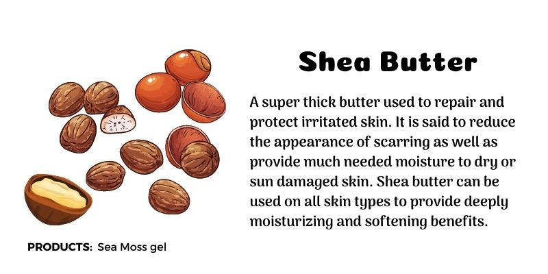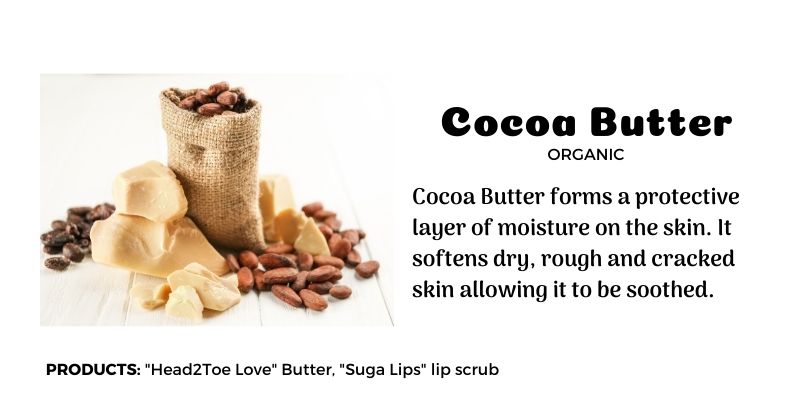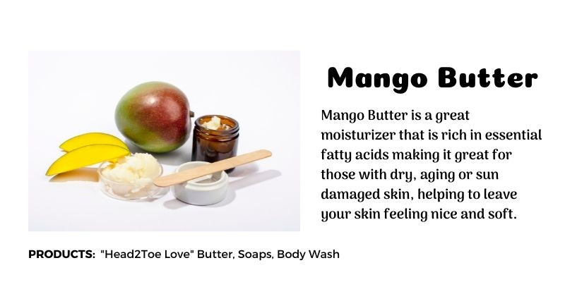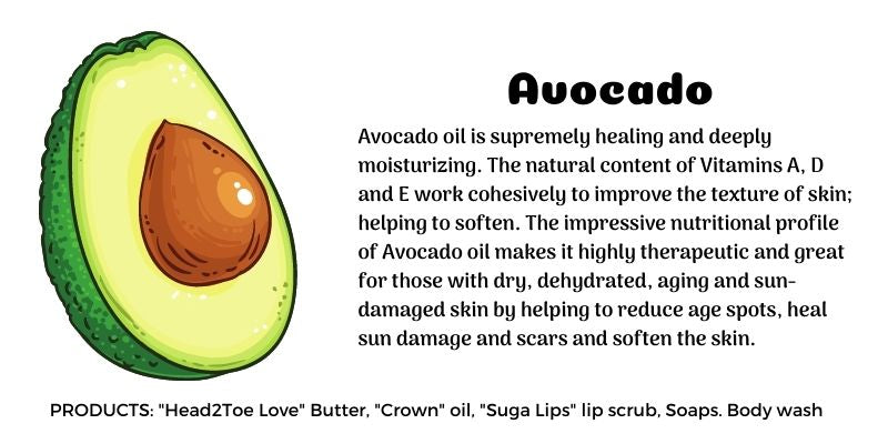 We have listed the varoius skin, hair, and body loving ingredients you're sure to find in our products. See which product best fits your needs to start and continue your journey of showing yourself love from head2toe!